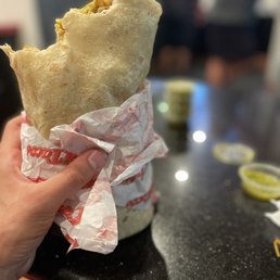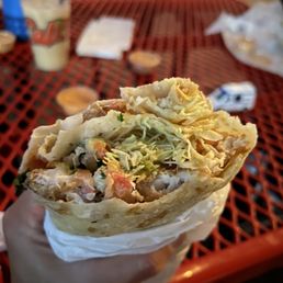 Be aware that the parking area is shared with a lot of other outlets in the strip mall area so parking can be an issue. But on the day that my hubby and I went, we were lucky to get parking right away but I noticed alot of people waiting for parking while we were eating. The eating area is also outside. They had like 3 tables inside but you could tell that this restaurant is more of a grab n go place. The tables were also not that clean as they were like the grated picnic tables and there were a lot of dried on food from previous people that had eaten there. So just don't look too close to it. Lol The food on the other hand came out quick! I was shocked at how fast the food came out AND omg the food was sooooooooooooo freaking HOT that my hands were burning while holding it BUT that's not a bad thing in my books. And these burritos were HUGE. I even asked for mine with less potatoes and even then they were HUGE, but the flavor was great! I could've finish mine and my hubby loved his as well. Lol They also had the normal salsa and picked veg area. The salsa was delicious... My favorite was the green one as it just tasted fresher to me. The red one, it tasted more like it has been cooked and I prefer the fresher non cooked ones. The price was good for what the hubby and I ordered and the food was fresh fresh fresh!! I just wished that it was closer to me!